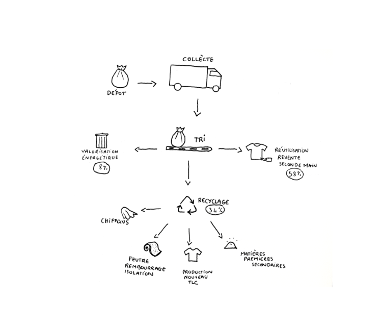 Tous vos vêtements sont collectés par des associations ou entreprises de la filière historique du tri et du recyclage. Ils sont triés à la main et 98,8% sont revalorisés : donnés, revendus en seconde main, recyclés en nouvelle matière ou transformés en énergie (combustible de récupération).